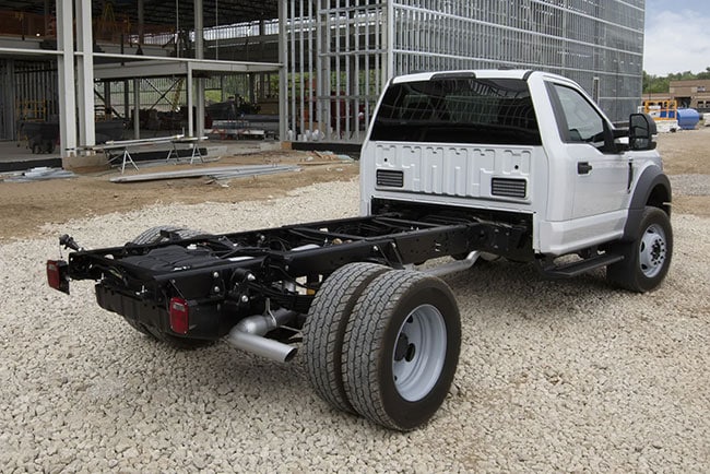 The Ford Chassis Cab F-450 features steel C-channel rails and crossmember that are up to 6.7-mm thick with a yield strength of 36,000 psi. Available with Single-Rear-Wheels (SRW) or Dual-Real-Wheels (DRW), traction control on Super Duty dual-rear-wheel chassis cab models uses the engine-only traction control to reduce wheel-spin by reducing throttle output.