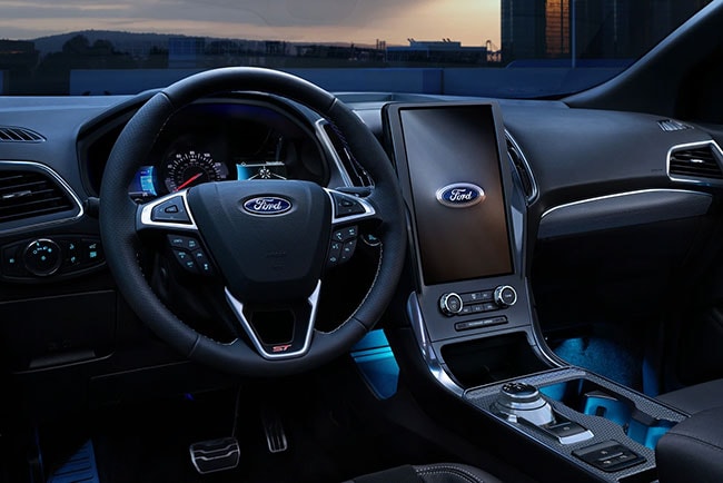 Maximizing comfort and style, the unique Sport interior offers leather-trimmed seats and perforated Miko suede inserts. Paired with a design that inspires, the Ford Edge offers state-of-the-art technology that excites like an available panoramic Vista sunroof featuring a large forward panel that tilts up or opens fully and a fixed-rear skylight.