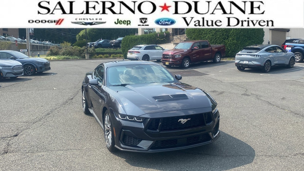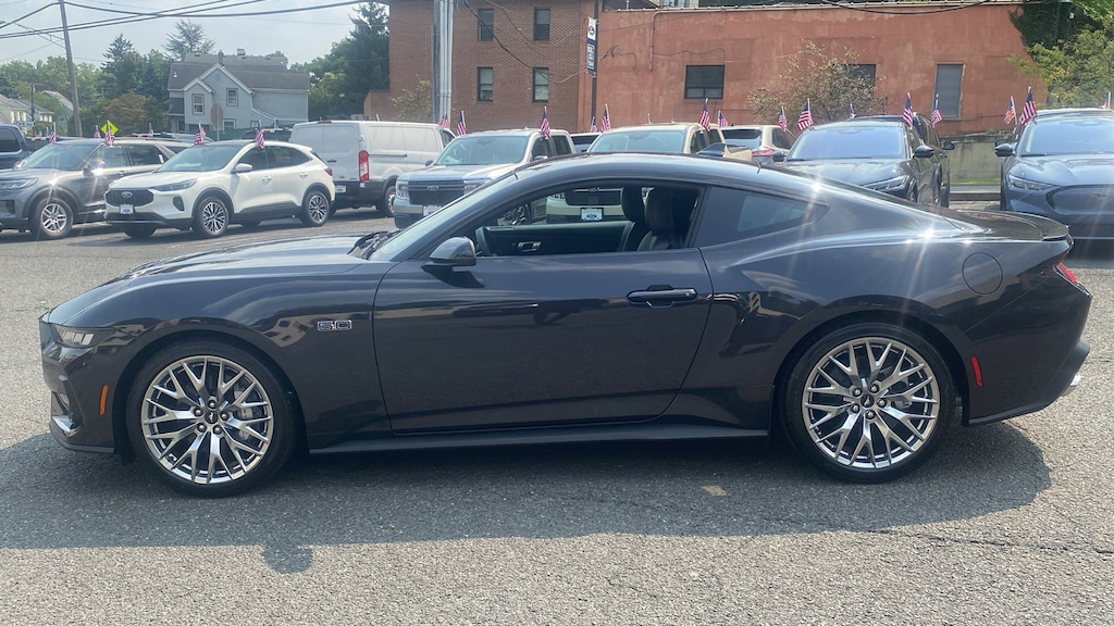 Dark Matter Gray Metallic 2024 Ford Mustang GT Premium RWD 10-Speed Automatic 5.0L V8 Ti-VCT 20 Wheels, 3.55 Limited Slip Rear Axle, 4-Wheel Disc Brakes, ABS brakes, Air Conditioning, Alloy wheels, AM/FM Stereo, Auto High-beam Headlights, Automatic temperature control, Brake assist, Bumpers: body-color, Compass, Delay-off headlights, Driver door bin, Driver vanity mirror, Dual front impact airbags, Dual front side impact airbags, Electronic Stability Control, Emergency communication system: 911 Assist, Equipment Group 400A Standard Package, Exterior Parking Camera Rear, Four wheel independent suspension, Front anti-roll bar, Front Bucket Seats, Front Center Armrest, Front reading lights, Fully automatic headlights, Illuminated entry, Knee airbag, Leather Shift Knob, Leather steering wheel, Low tire pressure warning, Occupant sensing airbag, Outside temperature display, Overhead airbag, Overhead console, Panic alarm, Passenger door bin, Passenger vanity mirror, Power door mirrors, Power steering, Power windows, Premium Floor Liners Front & Rear (w/Carpet Mats), Radio data system, Rain sensing wipers, Rear anti-roll bar, Rear Parking Sensors, Rear window defroster, Remote keyless entry, Speed control, Speed-sensing steering, Speed-Sensitive Wipers, Split folding rear seat, Spoiler, Sport steering wheel, Steering wheel mounted audio controls, SYNC 4.0 QNX, Tachometer, Telescoping steering wheel, Tilt steering wheel, Traction control, Trip computer, Variably intermittent wipers, Voltmeter, Wheels: 20 x 9 Premium-Painted Aluminum.