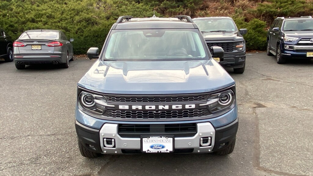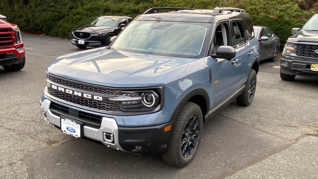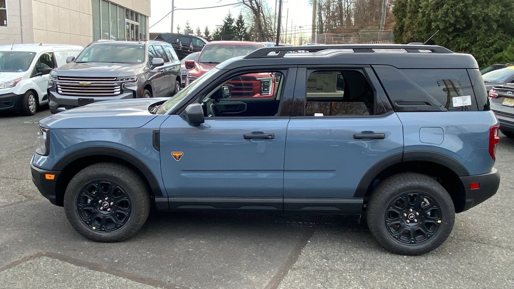 Azure / Gray 2025 Ford Bronco Sport Badlands 4WD 8-Speed Automatic EcoBoost 2.0L I4 GTDi DOHC Turbocharged VCT 4-Wheel Disc Brakes, 6 Speakers, ABS brakes, Air Conditioning, Alloy wheels, AM/FM radio: SiriusXM, AM/FM Stereo, Auto High-beam Headlights, Auto-dimming Rear-View mirror, Automatic temperature control, Brake assist, Compass, Delay-off headlights, Driver door bin, Driver vanity mirror, Dual front impact airbags, Dual front side impact airbags, Electronic Stability Control, Emergency communication system: SYNC 4 911 Assist, Four wheel independent suspension, Front anti-roll bar, Front Bucket Seats, Front Center Armrest, Front fog lights, Front reading lights, Fully automatic headlights, Garage door transmitter, Heated door mirrors, Heated front seats, Heated steering wheel, Illuminated entry, Knee airbag, Leather Trimmed Front Bucket Seats, Low tire pressure warning, Memory seat, Occupant sensing airbag, Outside temperature display, Overhead airbag, Overhead console, Panic alarm, Passenger door bin, Passenger vanity mirror, Power door mirrors, Power driver seat, Power passenger seat, Power steering, Power windows, Radio data system, Rear anti-roll bar, Rear reading lights, Rear seat center armrest, Rear window defroster, Rear window wiper, Remote keyless entry, Security system, SiriusXM, Speed control, Speed-sensing steering, Speed-Sensitive Wipers, Split folding rear seat, Steering wheel mounted audio controls, SYNC 4 w/Enhanced Voice Recognition, Tachometer, Telescoping steering wheel, Tilt steering wheel, Traction control, Trip computer, Variably intermittent wipers, Wheels: 17 Matte Black-Painted Aluminum.