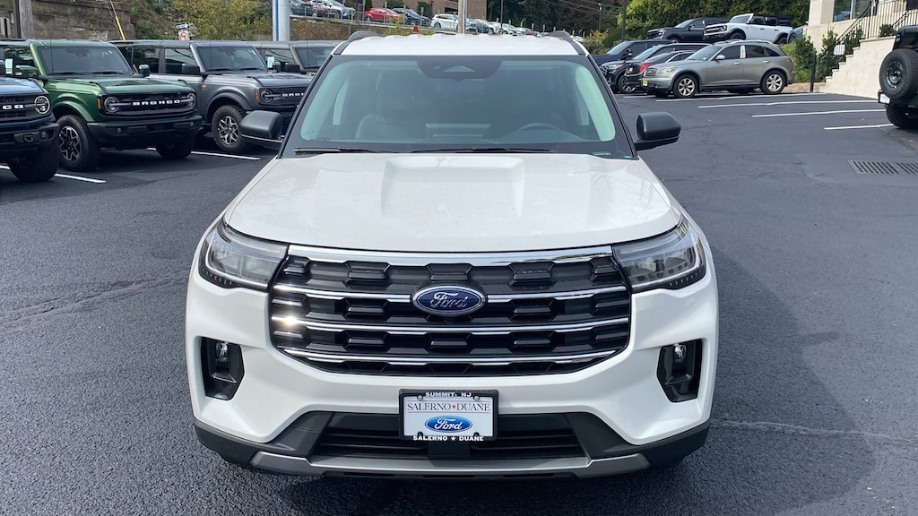 White 2025 Ford Explorer Active 4WD 10-Speed Automatic 2.3L EcoBoost I-4 4WD, 3.58 Non-Limited Slip Rear Axle, 3rd row seats: bench, 4-Wheel Disc Brakes, 6 Speakers, ABS brakes, Air Conditioning, Alloy wheels, AM/FM radio: SiriusXM with 360L, AM/FM Stereo, Apple CarPlay/Android Auto, Auto High-beam Headlights, Automatic temperature control, Brake assist, Bumpers: body-color, Compass, Delay-off headlights, Driver door bin, Driver vanity mirror, Dual front impact airbags, Dual front side impact airbags, Electronic Stability Control, Emergency communication system: 911 Assist, Exterior Parking Camera Rear, Four wheel independent suspension, Front anti-roll bar, Front Bucket Seats, Front Center Armrest, Front dual zone A/C, Front reading lights, Fully automatic headlights, Heated door mirrors, Heated front seats, Illuminated entry, Knee airbag, Leather steering wheel, Low tire pressure warning, Navigation System, Occupant sensing airbag, Outside temperature display, Overhead airbag, Overhead console, Panic alarm, Passenger door bin, Passenger vanity mirror, Power door mirrors, Power driver seat, Power Liftgate, Power passenger seat, Power steering, Power windows, Rear air conditioning, Rear anti-roll bar, Rear reading lights, Rear window defroster, Rear window wiper, Remote keyless entry, Security system, Speed control, Speed-sensing steering, Speed-Sensitive Wipers, Split folding rear seat, Spoiler, Steering wheel mounted audio controls, Tachometer, Telescoping steering wheel, Tilt steering wheel, Traction control, Trip computer, Unique Heated Cloth Captain's Chairs, Variably intermittent wipers, Wheels: 18 Sparkle Silver-Painted Aluminum, 4WD.