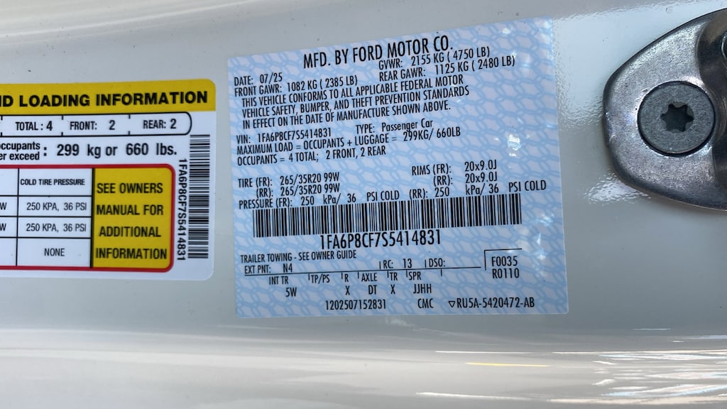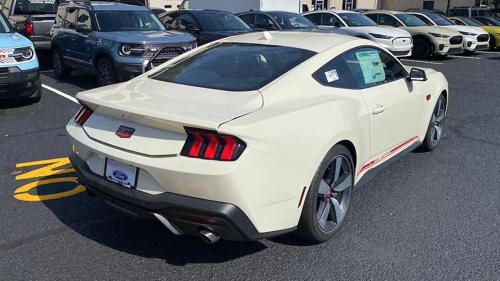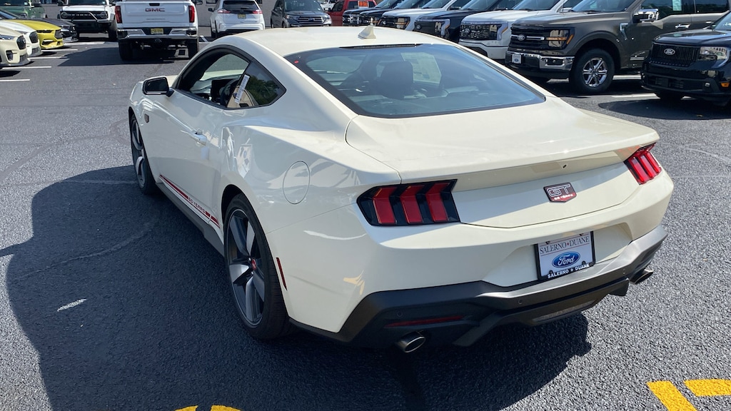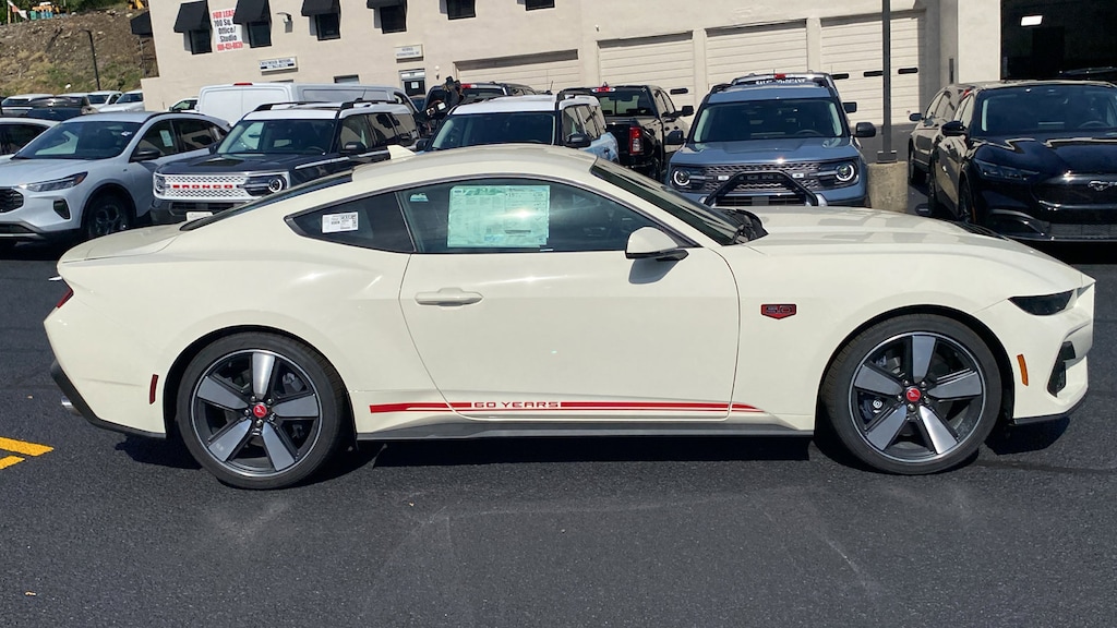 Wimbledon White 2025 Ford Mustang GT Premium RWD 6-Speed Manual 5.0L V8 Ti-VCT 3.55 Limited Slip Rear Axle, 4-Wheel Disc Brakes, 60th Anniversary Package, ABS brakes, Air Conditioning, Alloy wheels, AM/FM Stereo, Anniversary Special Edition Badge, Auto High-beam Headlights, Automatic temperature control, B&O Sound System by Bang & Olufsen w/12 Speakers, Brake assist, Brembo Brake System, Brembo Brake System w/Performance Linings, Bumpers: body-color, Carpeted Floor Mats - Left Side Fr/Rr w/Logo (DIO), Compass, Delay-off headlights, Driver door bin, Driver vanity mirror, Dual front impact airbags, Dual front side impact airbags, Electronic Stability Control, Emergency communication system: 911 Assist, Equipment Group 401A High Package, Exterior Parking Camera Rear, Ford Co-Pilot360 Assist+, Four wheel independent suspension, Front anti-roll bar, Front Bucket Seats, Front Center Armrest, Front dual zone A/C, Front reading lights, Fully automatic headlights, Illuminated Door-Sill Scuff Plates, Illuminated entry, Internet access capable: FordPass Connect, Knee airbag, Leather Shift Knob, Leather steering wheel, Low tire pressure warning, Occupant sensing airbag, Outside temperature display, Overhead airbag, Overhead console, Painted High Gloss Black Honeycomb Grille, Panic alarm, Passenger door bin, Passenger vanity mirror, Power door mirrors, Power steering, Power windows, Radio data system, Rain sensing wipers, Rear anti-roll bar, Rear Parking Sensors, Rear window defroster, Remote keyless entry, Speed control, Speed-sensing steering, Speed-Sensitive Wipers, Split folding rear seat, Spoiler, Sport steering wheel, Steering wheel mounted audio controls, SYNC 4, Tachometer, Telescoping steering wheel, Tilt steering wheel, Traction control, Trip computer, Variably intermittent wipers, Voltmeter. Not all customers qualify for all incentives. See Dealer for details. Price includes: $3500 - Retail Customer Cash. Exp. 04/30/2026