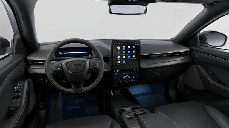 Blue 2026 Ford Mustang Mach-E Select AWD Single-Speed Automatic Dual Electric Motor 4-Wheel Disc Brakes, 6 Speakers, ABS brakes, ActiveX Bucket Seats, Air Conditioning, Alloy wheels, AM/FM radio: SiriusXM with 360L, AM/FM Stereo, Apple CarPlay/Android Auto, Auto High-beam Headlights, Auto-dimming Rear-View mirror, Automatic temperature control, Brake assist, Bumpers: body-color, Compass, Delay-off headlights, Driver door bin, Driver vanity mirror, Dual front impact airbags, Dual front side impact airbags, Electronic Stability Control, Emergency communication system: 911 Assist, Exterior Parking Camera Rear, Four wheel independent suspension, Front anti-roll bar, Front Bucket Seats, Front Center Armrest, Front dual zone A/C, Front reading lights, Fully automatic headlights, Heated door mirrors, Illuminated entry, Knee airbag, Low tire pressure warning, Navigation system: Connected Navigation, Occupant sensing airbag, Outside temperature display, Overhead airbag, Overhead console, Panic alarm, Passenger door bin, Passenger vanity mirror, Power door mirrors, Power driver seat, Power steering, Power windows, Radio data system, Rain sensing wipers, Rear anti-roll bar, Rear seat center armrest, Rear side impact airbag, Rear window defroster, Rear window wiper, Remote keyless entry, Security system, SiriusXM with 360L, Speed control, Speed-sensing steering, Speed-Sensitive Wipers, Split folding rear seat, Spoiler, Steering wheel mounted audio controls, SYNC 4A with Enhanced Voice Recognition, Telescoping steering wheel, Tilt steering wheel, Traction control, Trip computer, Turn signal indicator mirrors, Variably intermittent wipers, Wheels: 19 Machined-Face Aluminum.